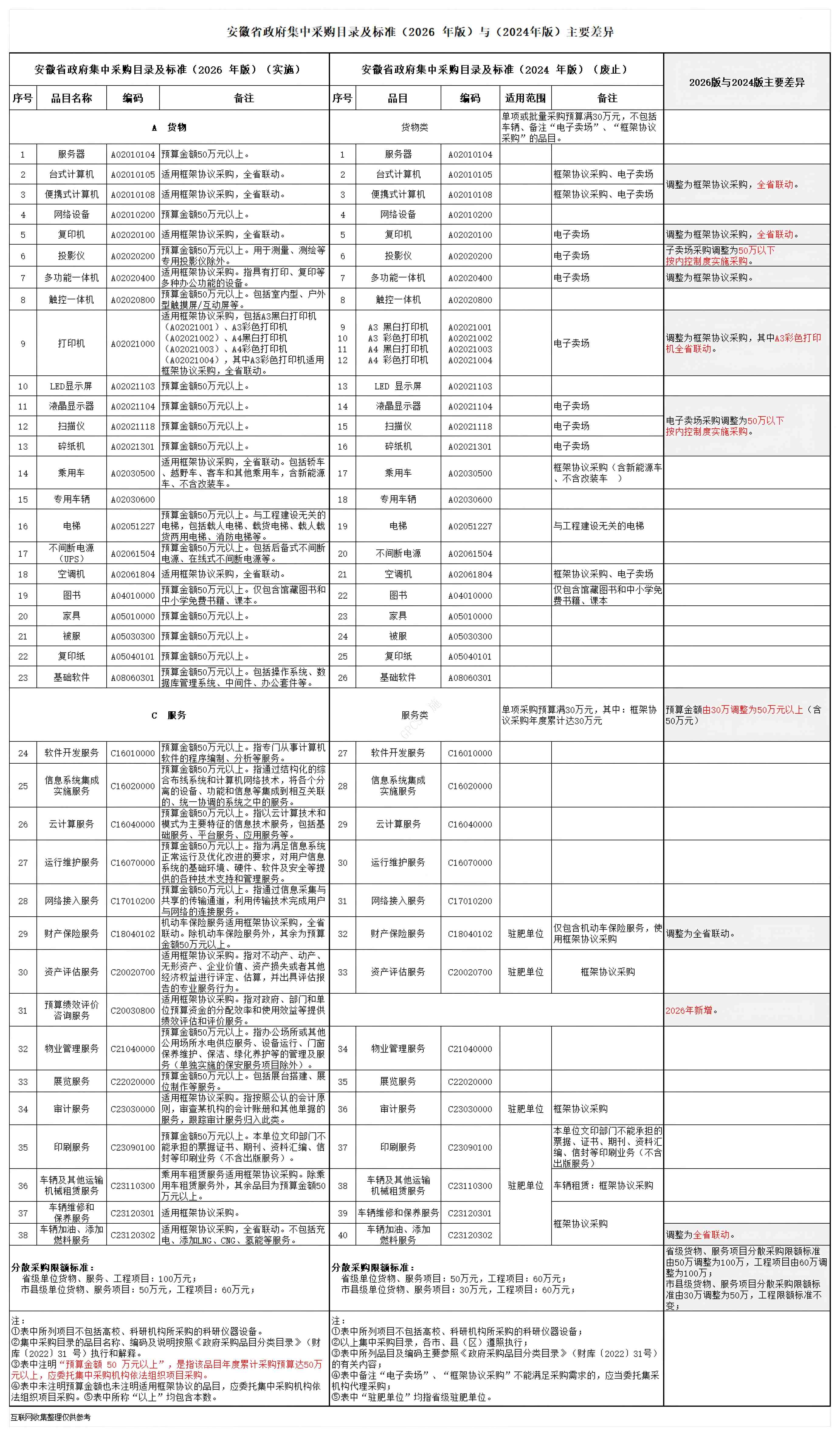 安徽省政府集中目录及标准(2026 年版)与(2024年版)主要差异